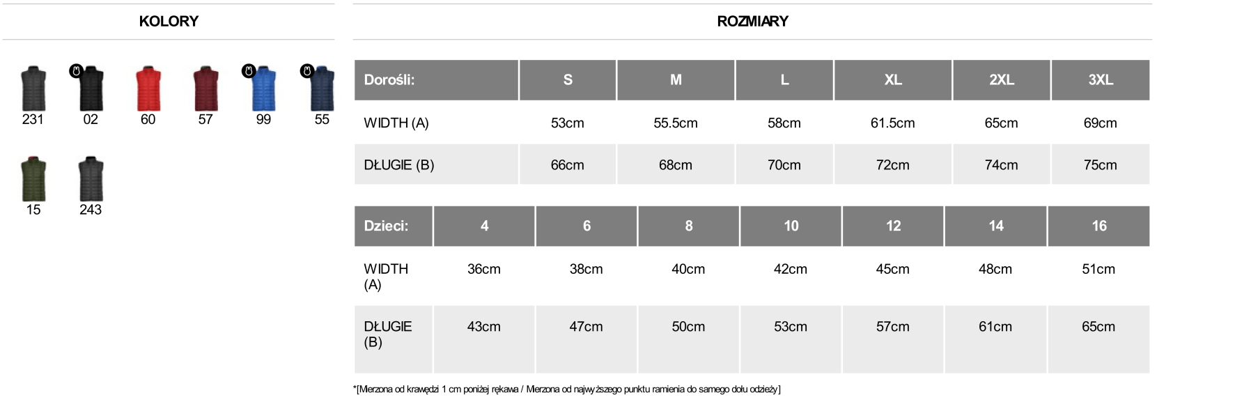 Dostępne kolory i tabela rozmiarowa (męskie)